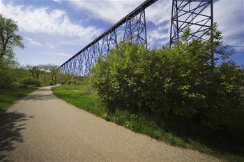 5.00 kilometer(s) from High Level Bridge, the longest and highest of its type in the world. This means that the design, called a viaduct by CPR bridge engineers, reached culmination in the Lethbridge bridge. There are similar bridges that are longer or higher, but none have the combination of length - height shown by the Lethbridge structure. The bridge is 5,327 feet (1,623 meters) in length (one mile plus 47 feet). It is 314 feet (95.7 meters) in height above the bed of the river. The west end is 21.31 feet higher than the east end. The east end is 3,800 feet west of what was the Lethbridge Station.